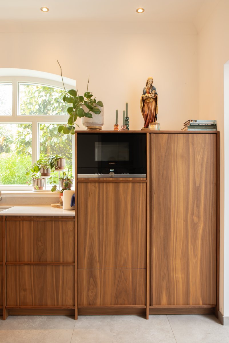 Om dit te realiseren kijken we al in een vroeg stadium naar de volledige indeling van het ontwerp. De maatvoering van de fronten, de positie van apparatuur, greeplijsten en andere onderbrekingen worden hierin zorgvuldig meegenomen. Zo blijft het lijnenspel van het hout logisch en rustig doorlopen door het gehele ontwerp.