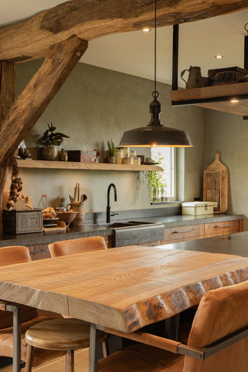 De vraag naar hout en natuurlijke materialen blijft groeien. Niet alleen fineer is enorm populair, ook worden materialen met de structuur van bijvoorbeeld leer, linnen of natuursteen steeds gewilder. Deze natuurlijke materialen worden vaak met elkaar gecombineerd om op deze manier karakter en de natuur in huis te halen. Een goed voorbeeld hiervan is de keuken hiernaast, waarbij massief houten balken worden gecombineerd met een houten eettafel en een donker granieten werkblad van