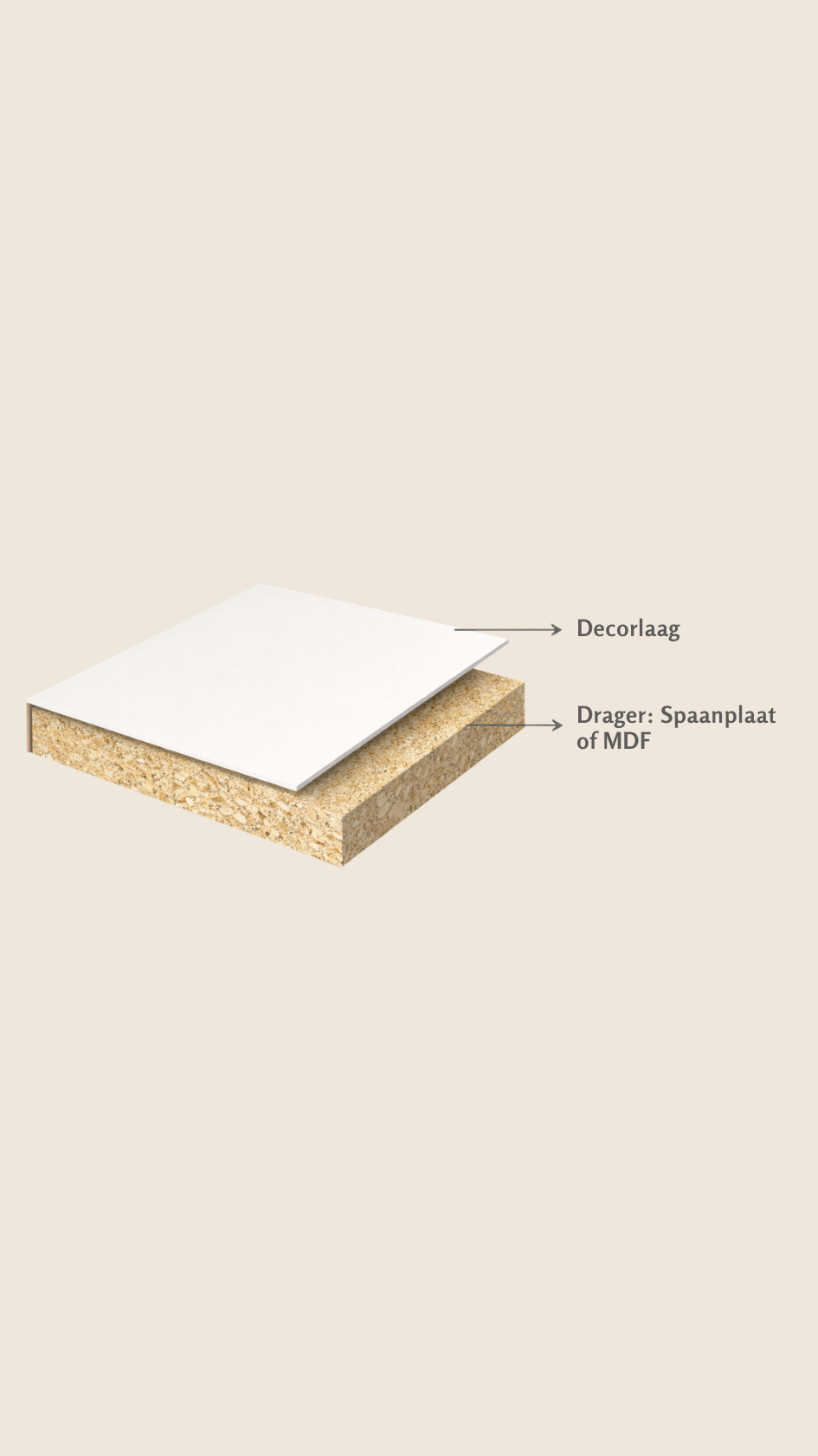 Melamine bestaat uit een decorlaag die onder hoge druk wordt samengeperst op een stevige drager, zoals spaanplaat of MDF. Het resultaat is een slijtvaste en kleurvaste afwerking die eenvoudig te reinigen is en jarenlang mooi blijft.