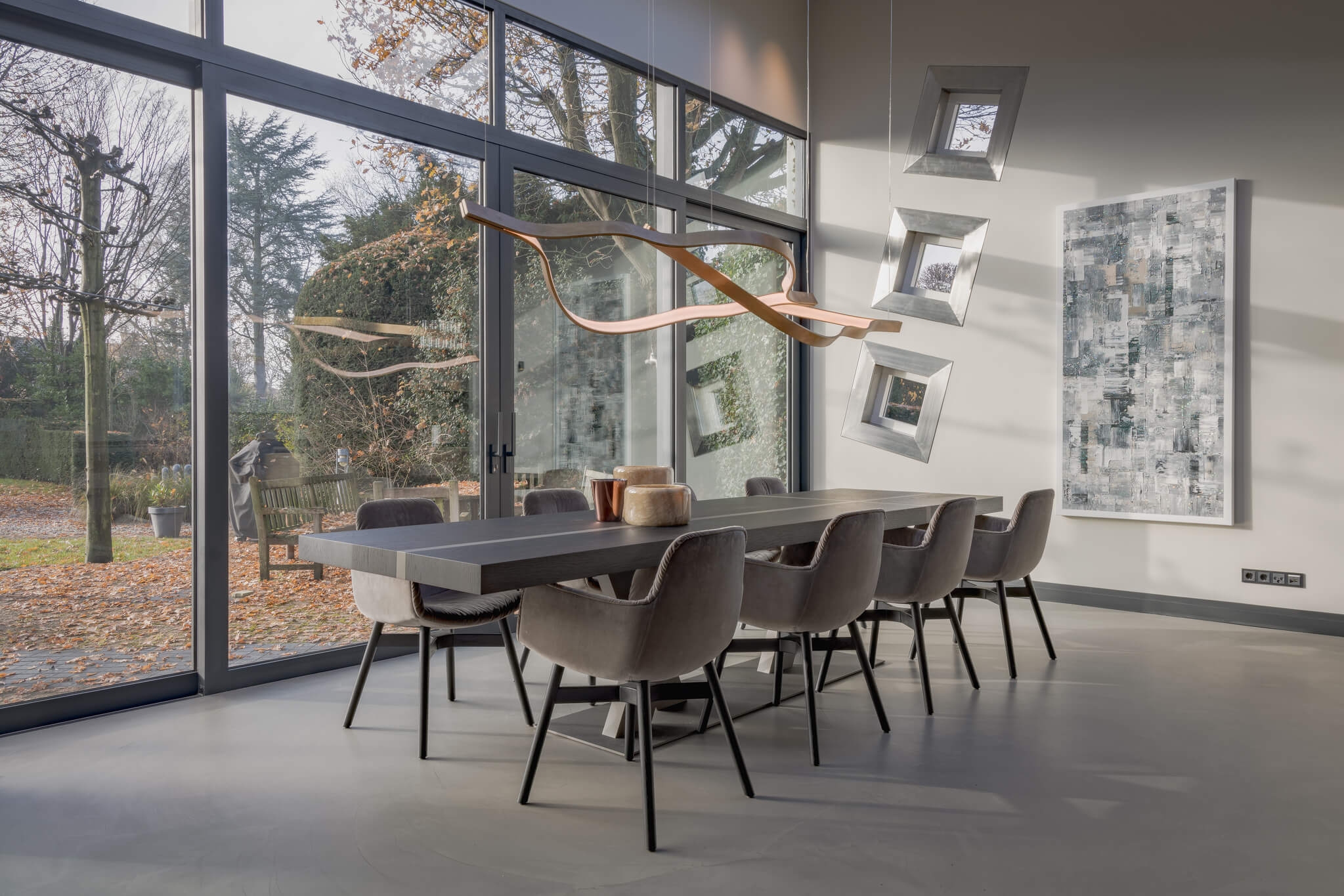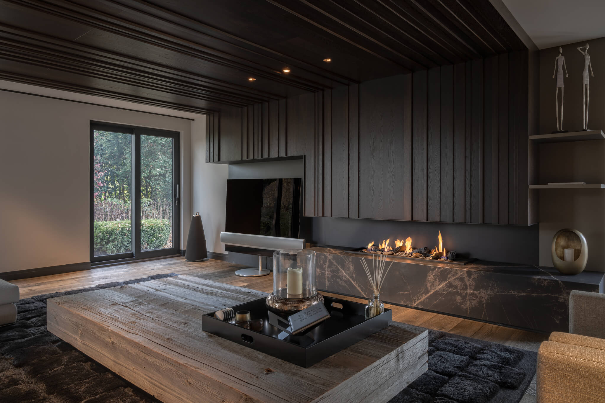 In de woonkamer van deze villa is een doorlopende panelenstructuur gerealiseerd. Deze panelenstructuur creëert extra diepte en karakter door de panelen subtiel te laten verspringen.