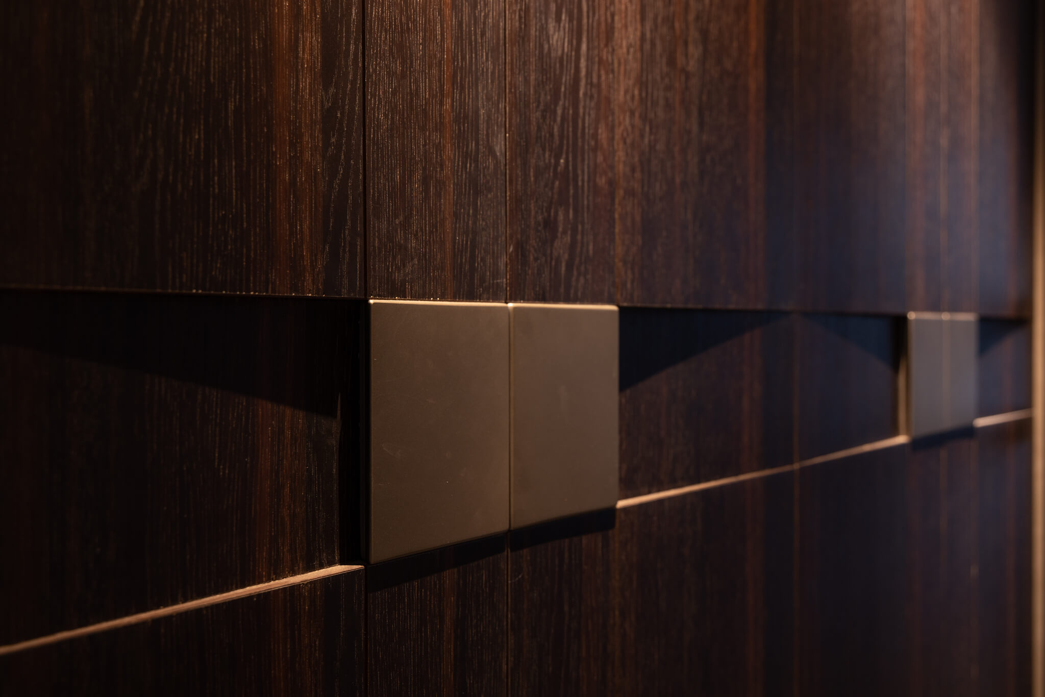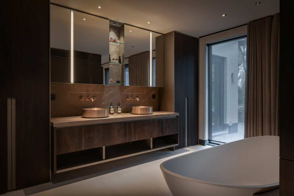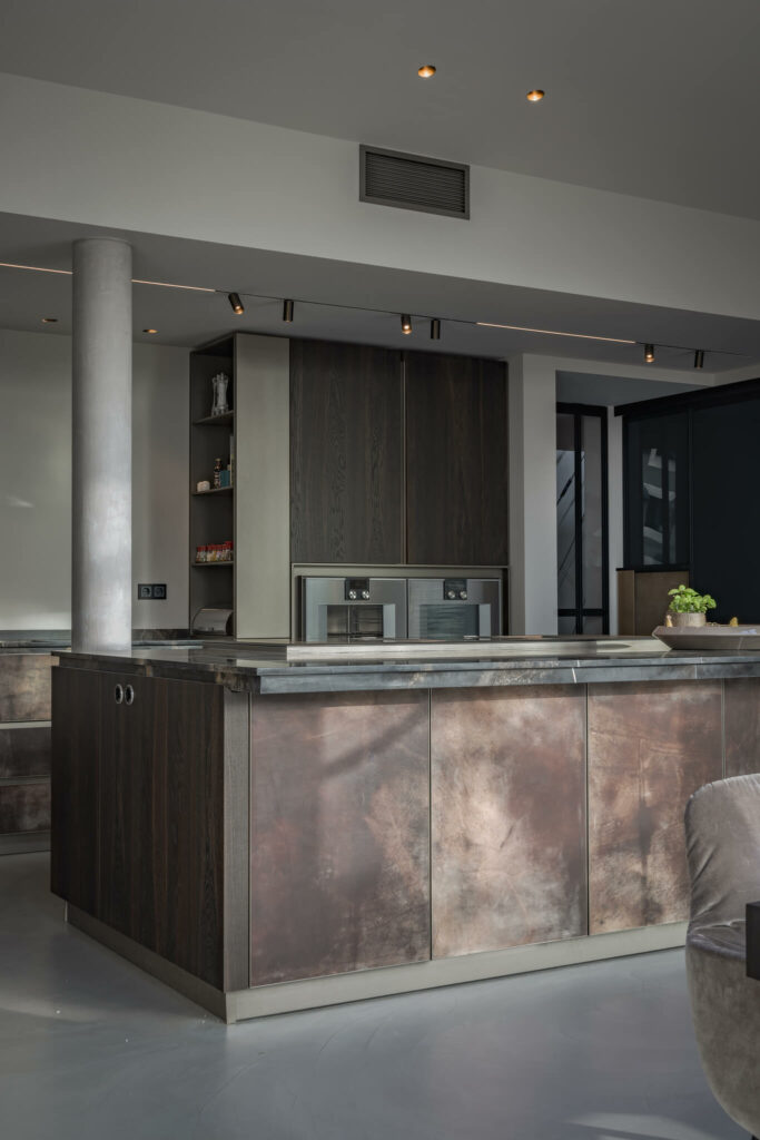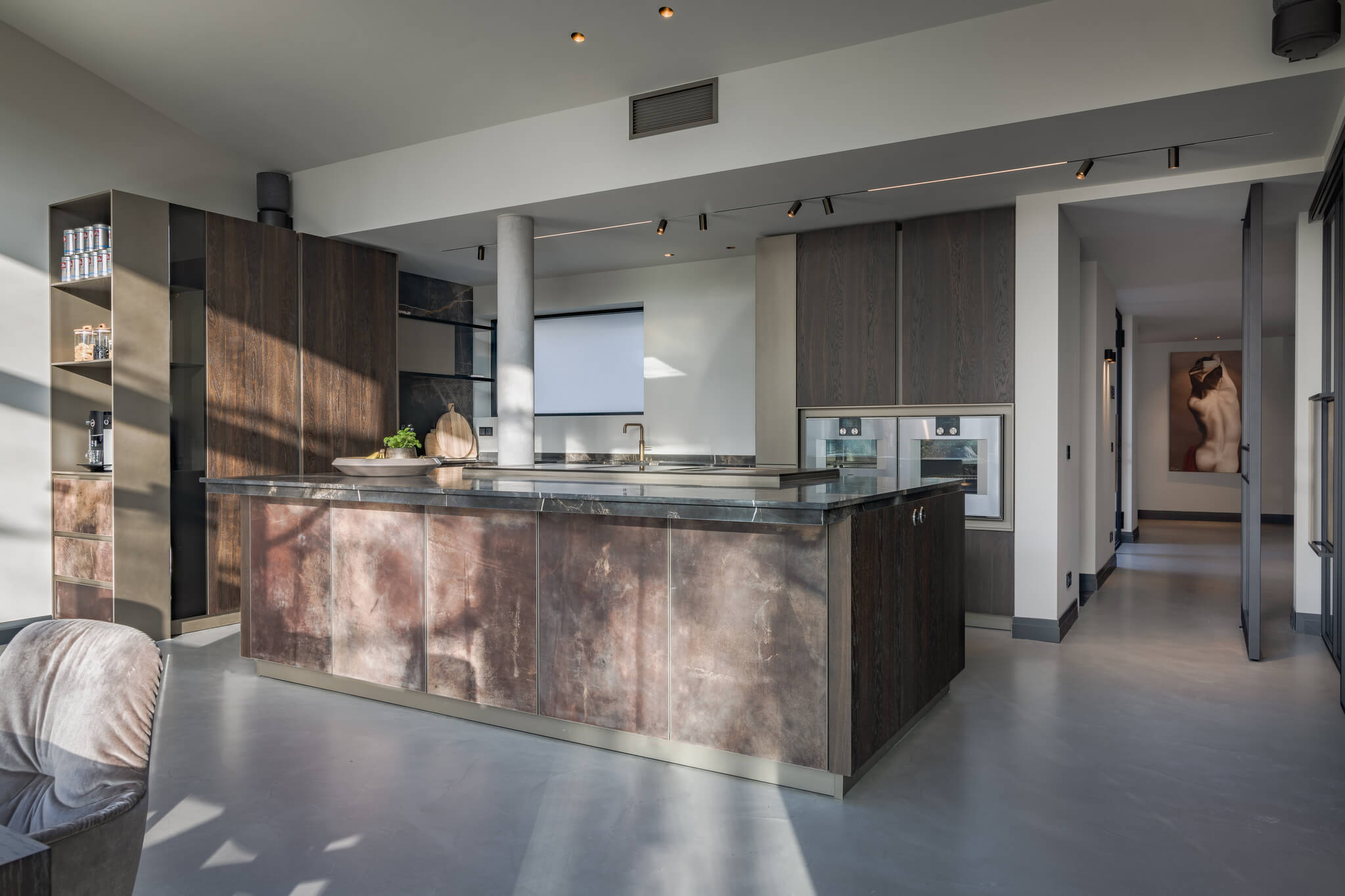 Een veel terugkomend materiaal in deze villa is gerookt eiken fineer. Dit donkere, warme fineer brengt sfeer en warmte in de woning. Verfijnde bronzen accenten maken de woning compleet. In de keuken is er gekozen voor 3 verschillende fronten, namelijk luxe lederen fronten, gerookt eiken fineer fronten en bronzen fronten. De combinatie met het donkere werkblad brengt de natuurlijke uitstraling naar de keuken.