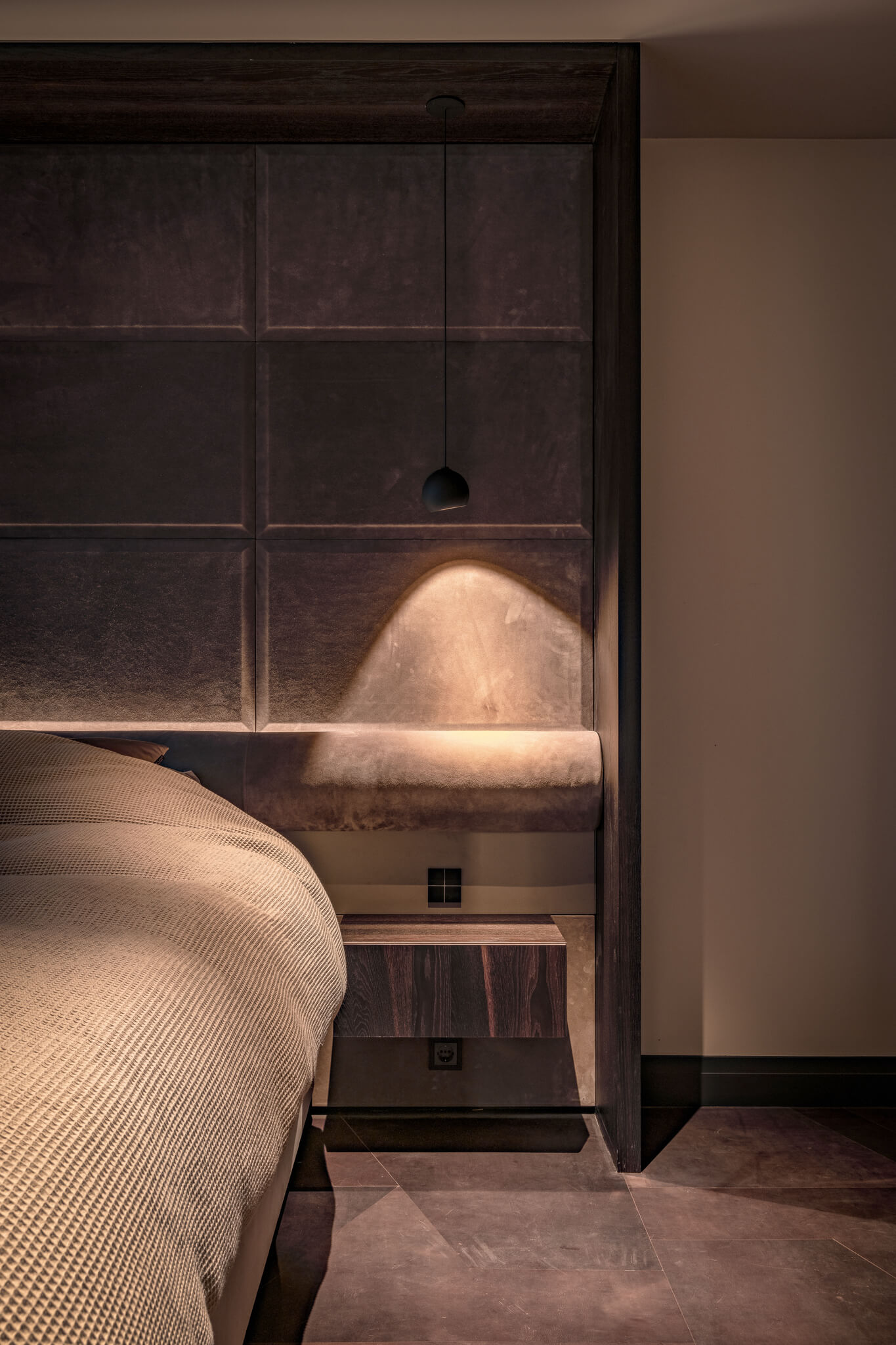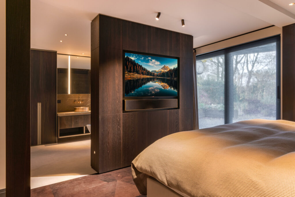 De slaapkamer en badkamer vormen samen een exclusieve suite. Een stijlvolle roomdivider scheidt het slaapgedeelte van de badkamer en functioneert tegelijkertijd als tv-meubel.
