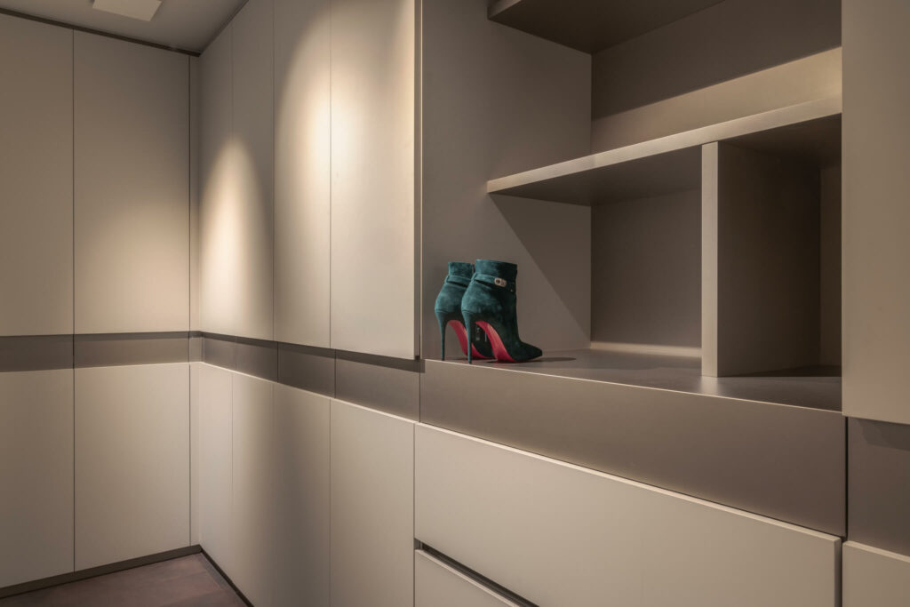 De imposante kastdeuren in de gang zijn uitgevoerd met verfijnde grepen die direct in het oog springen. Ze geven de entree een luxe uitstraling en zorgen voor een naadloze overgang naar de overige ruimtes.