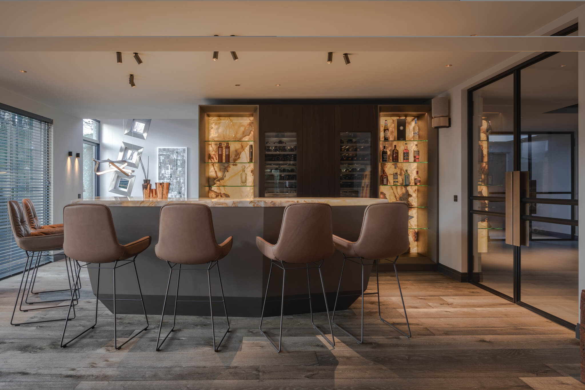 Een bar in de leefruimte. Deze sfeervolle bar is afgewerkt met gerookt eiken fineer fronten én met bronzen fronten. Deze twee warme fronten zorgen voor een uitnodigende uitstraling midden in de woning. Deze twee fronten worden meermalig gebruikt in de volledige villa.