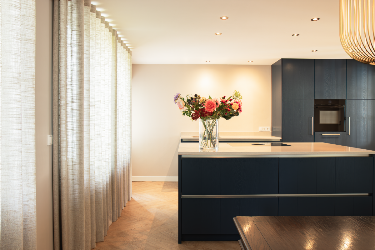Een ruim kookeiland waarbij in de gehele keuken een prachtig contrast te zien is tussen donkerblauwe fronten en het lichte werkblad. Een detail in deze keuken is dat de kastenwand 80 mm onder het plafond stopt, maar de fronten verder doorlopen tot 10 mm onder het plafond waardoor het lijkt alsof de kasten tot het plafond doorlopen.