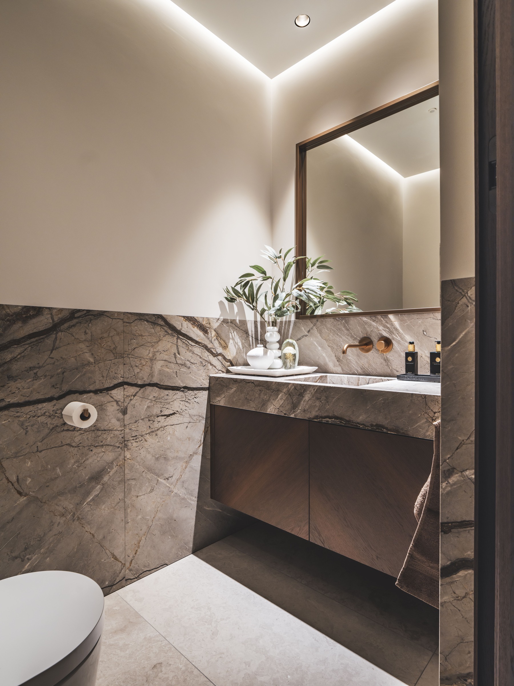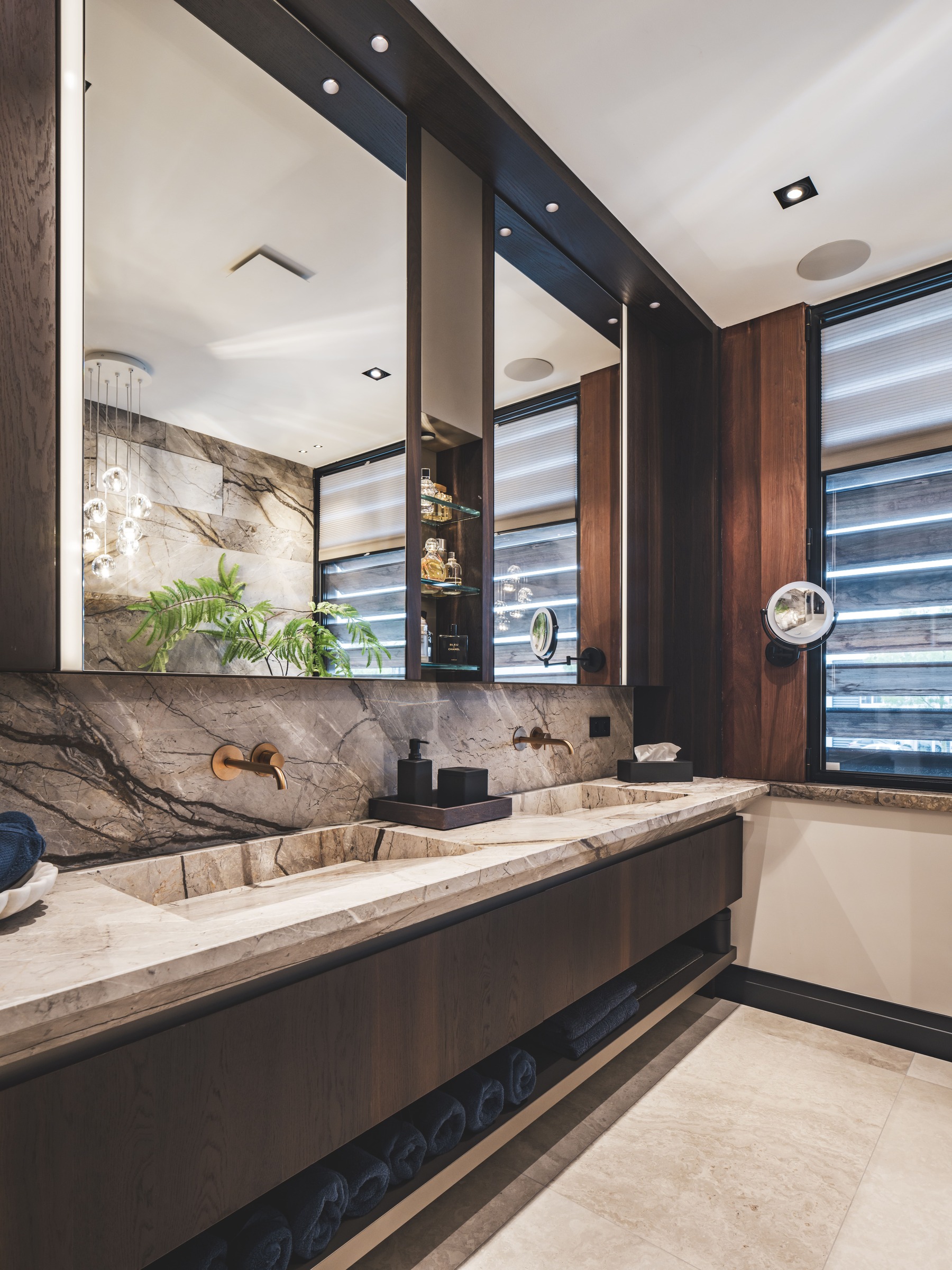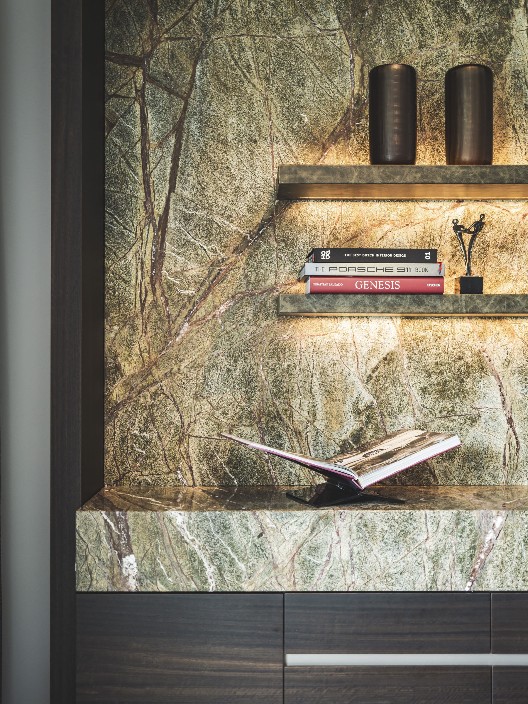 De materialen die in het totaal interieur terug komen zijn gerookt eiken fineer en natuursteen in de kleur Essential Grey. Het donkere fineer gaat perfect gepaard met het lichte natuursteen, waardoor er een prachtig contrast gecreëerd wordt.