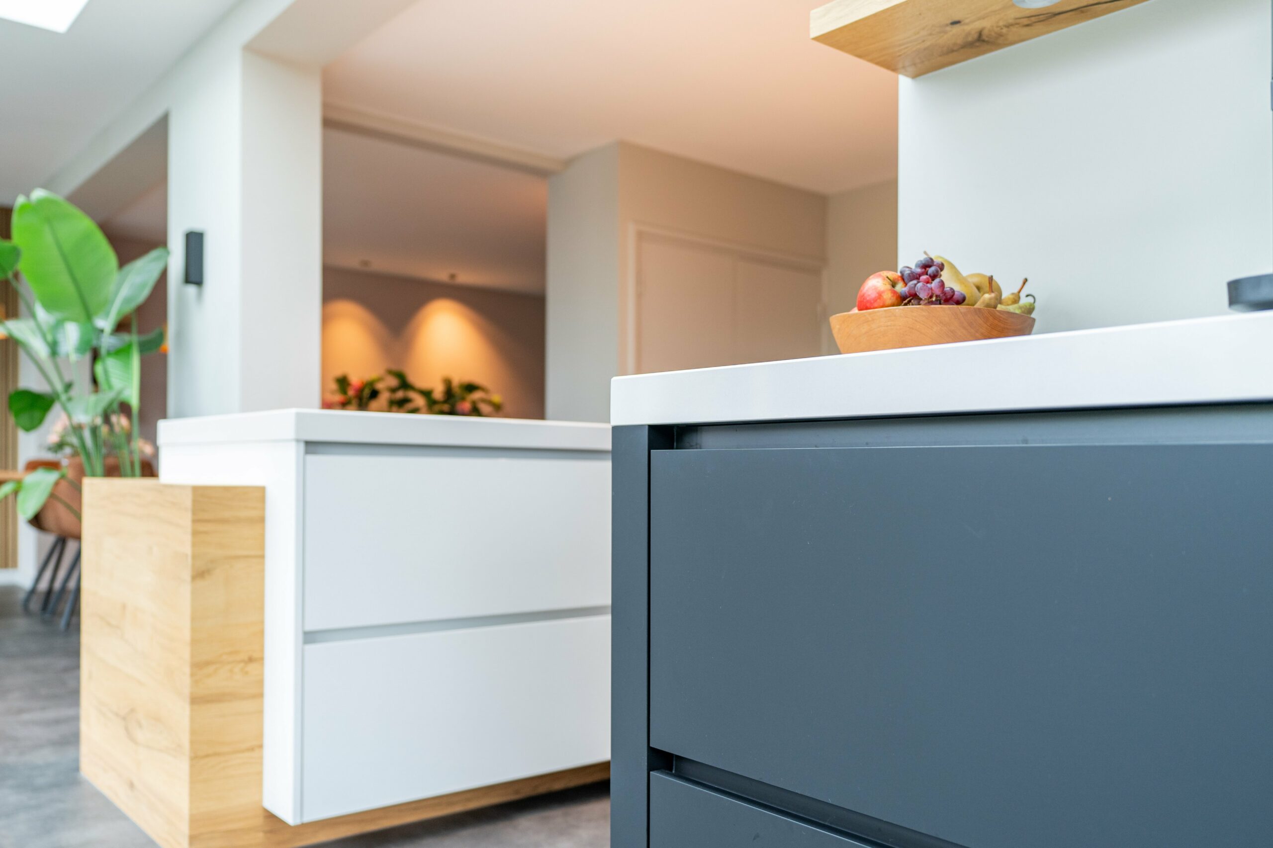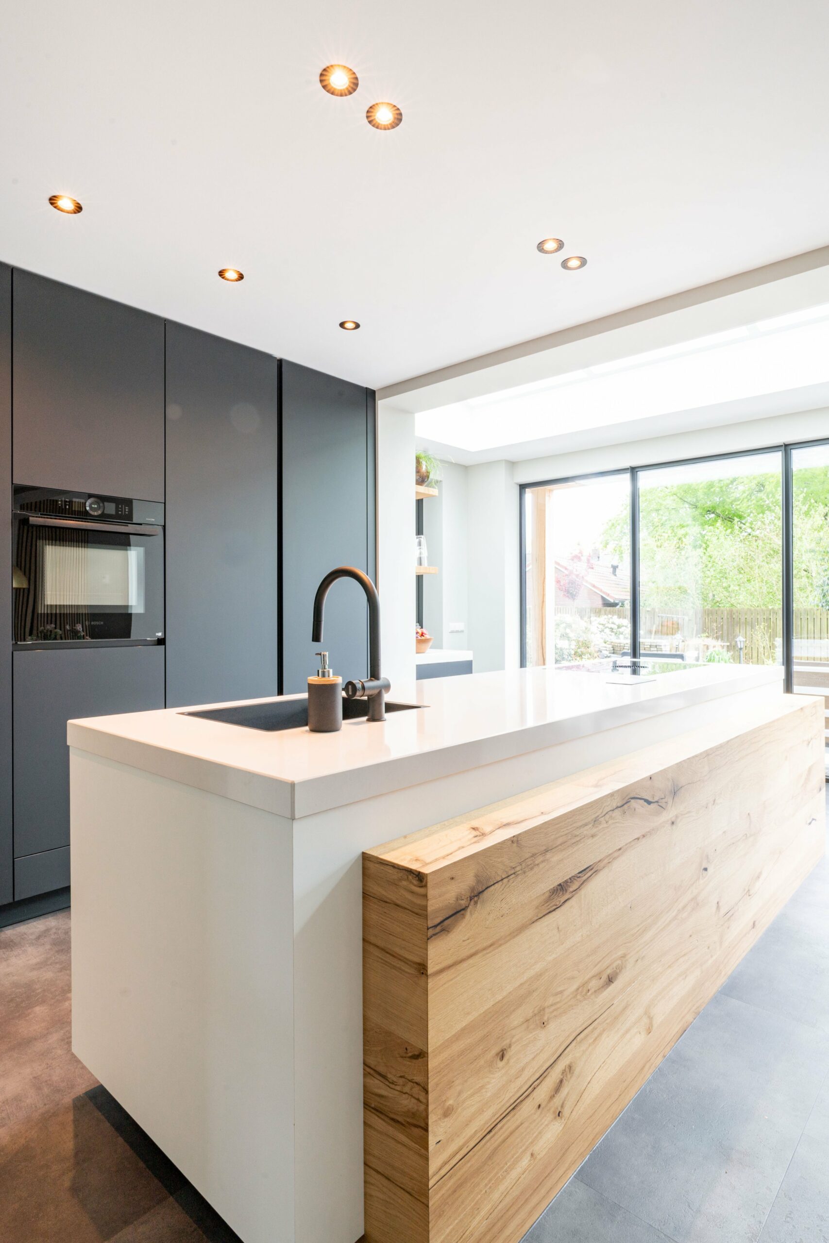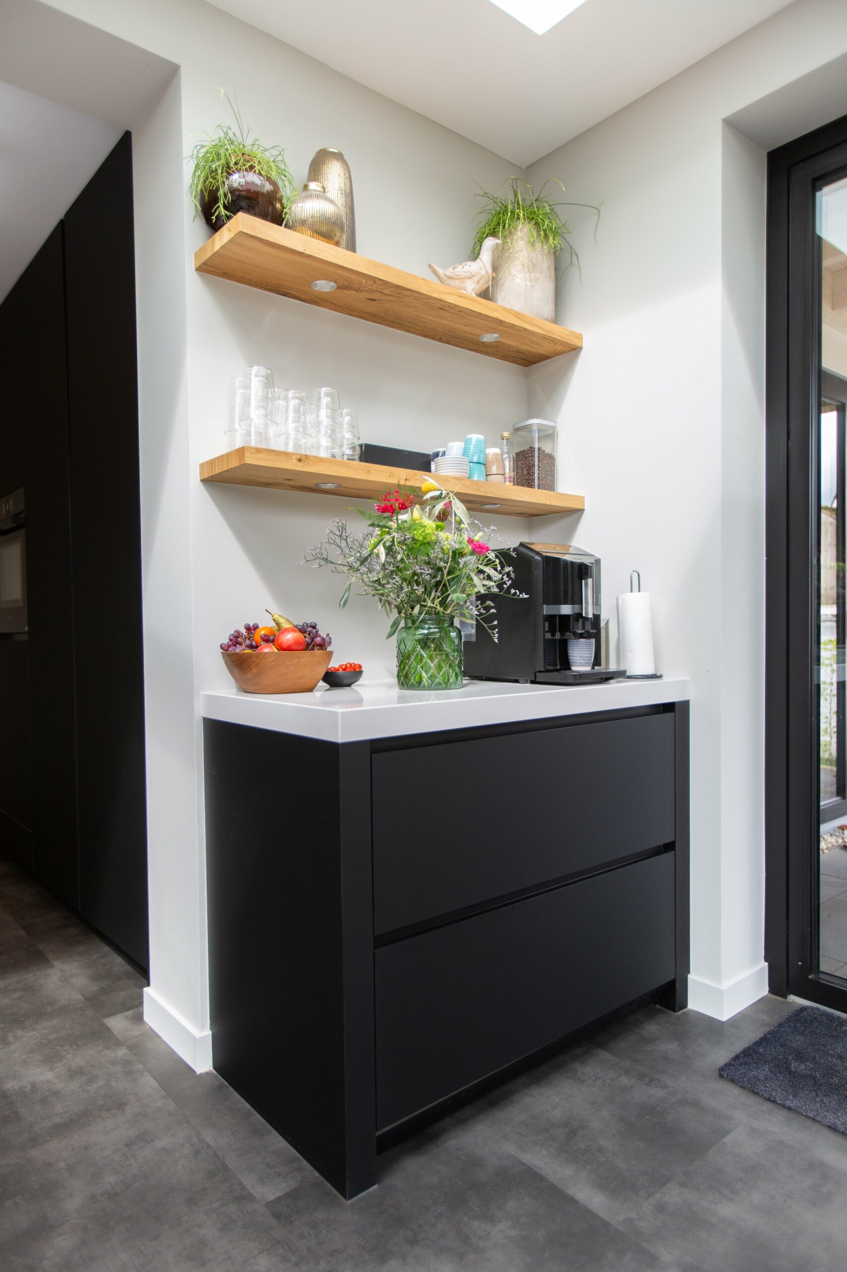 Bij dit project is er gekozen voor een minimalistische uitvoering met warme accenten. Doordat deze ruimte enorm veel lichtinval heeft, is de matzwarte kastenwand niet te donker of te somber. Deze donkere kastenwand in combinatie met het lichte kookeiland én de lichte ruimte zorgt voor een goede balans tussen licht en donker. Óók is er een koffiehoek in dezelfde stijl aan de keuken geplaatst.