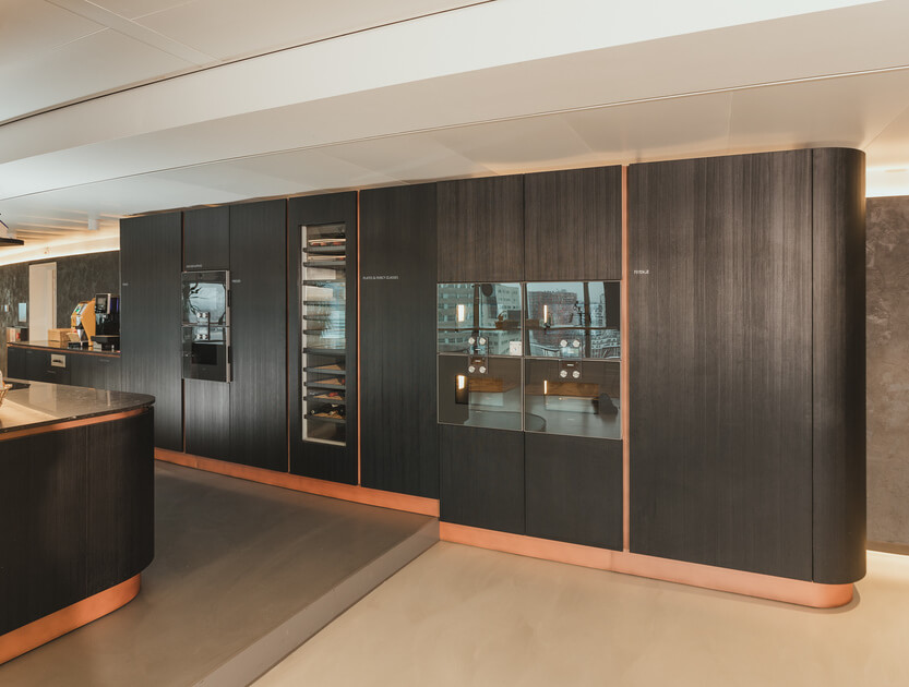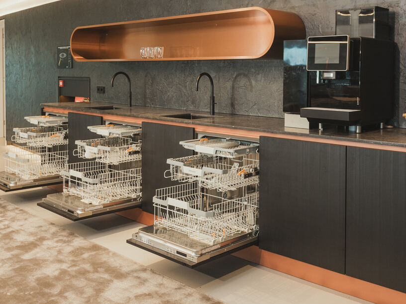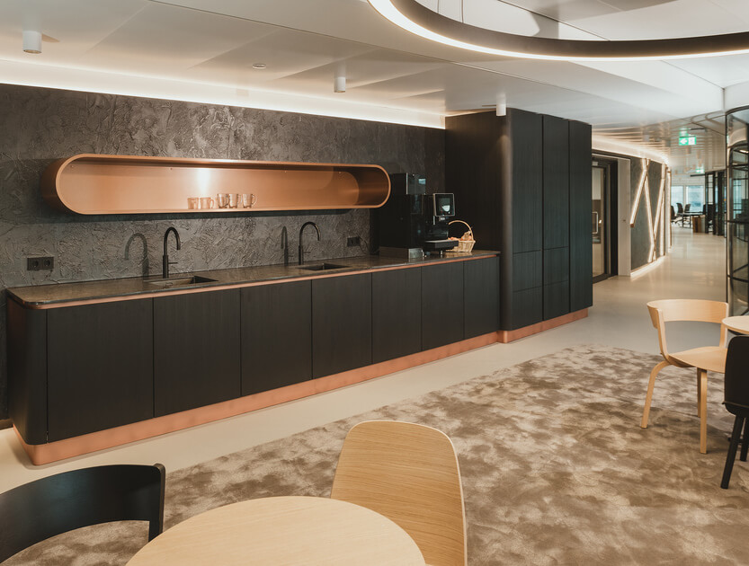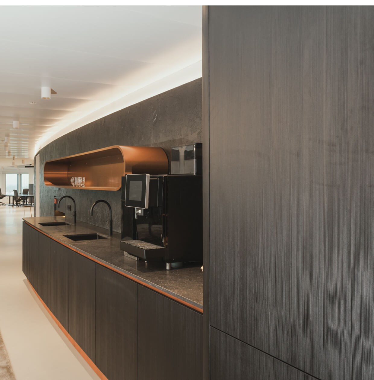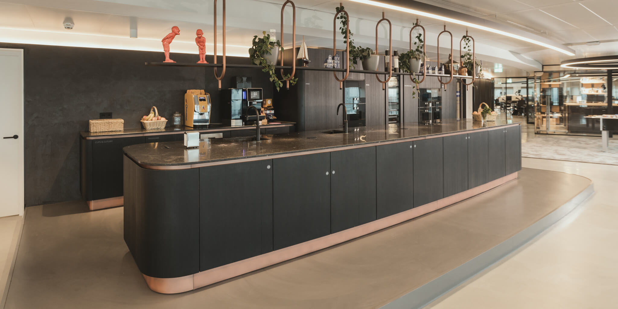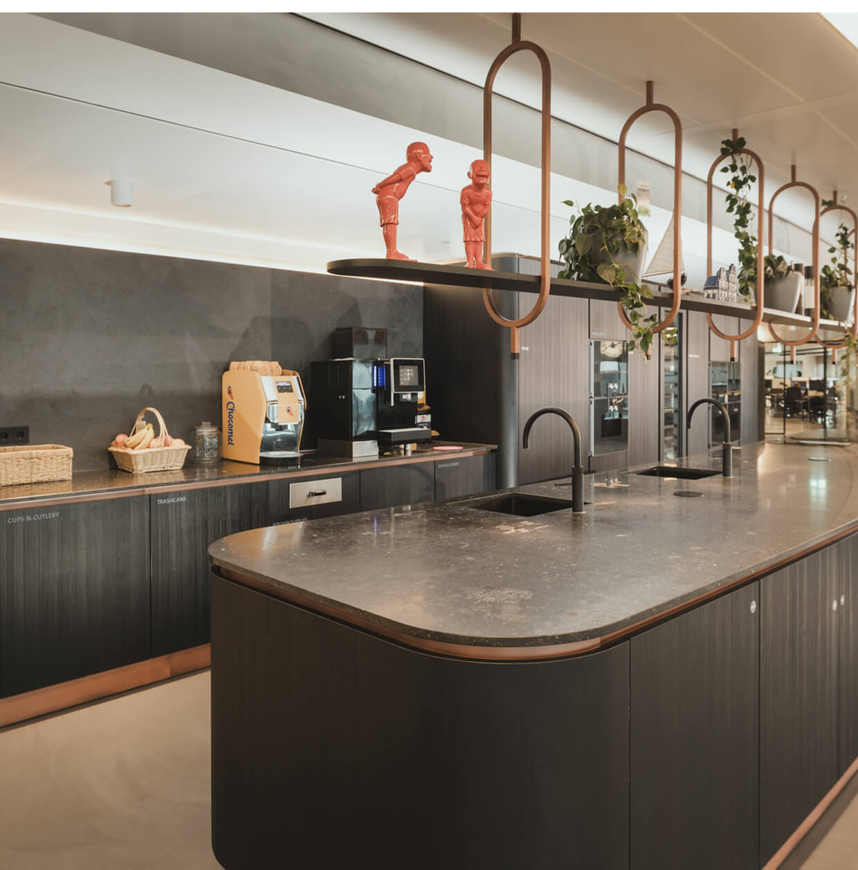 Beide keukens zijn uitgerust met Mereno Houston fronten in een zwarte kleur. Deze fronten laten ondanks de donkere kleur, veel van de houtnerf zien. Door de gehele keukens zijn koperen details terug te zien. Deze luxe koperen details maken de keukens ideaal voor een zakelijke omgeving.