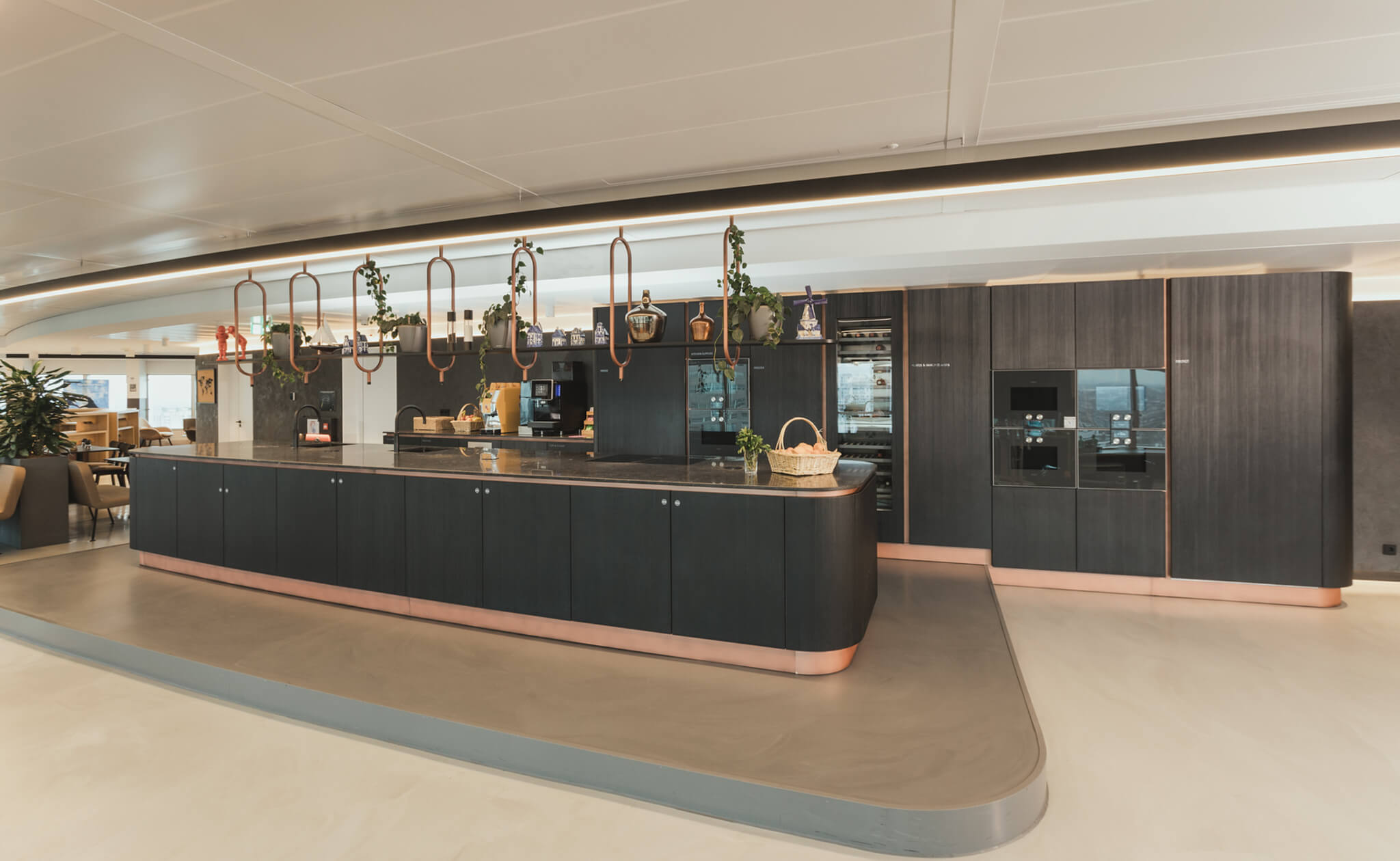 Een hoofdkeuken en een secundaire keuken. Beide keukens hebben een lichte ronding in zowel het kookeiland als de kastenwand, zodat deze perfect meebewegen met de rest van de ruimte. De ronde afwerking van de kookeilanden zorgt ervoor dat deze perfect past in de werkomgeving.