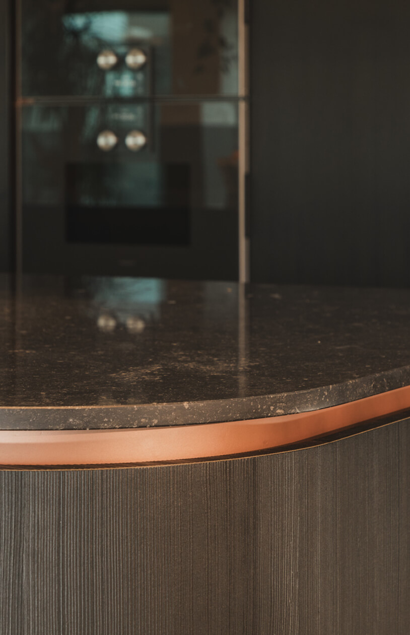 Doordat de keuken een lichte ronding heeft, vanwege de ruimte waar deze in is gerealiseerd, zijn ook onder andere de plinten en de greeplijsten voorzien van een lichte ronding. Deze details zorgen ervoor dat de keuken in zijn geheel naadloos doorloopt.