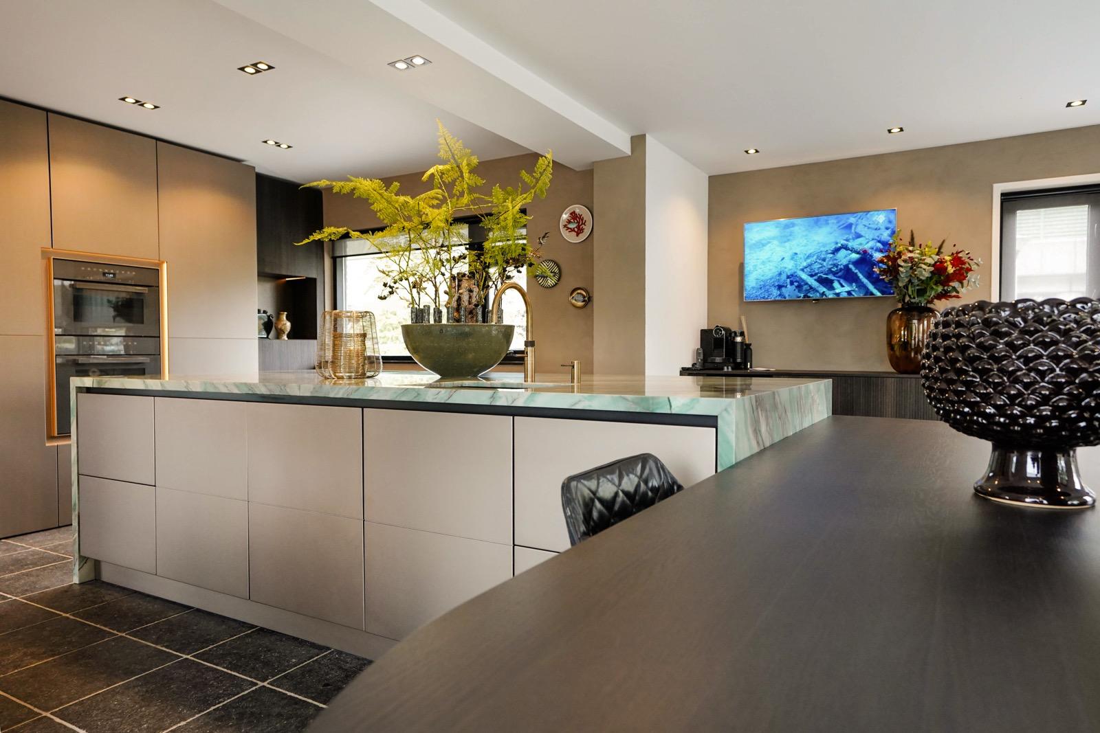 Een royale leefkeuken waarin materialen, vormen en functies in elkaar overvloeien. Het eiland loopt door in een tafel met bar en zitbank, waardoor één samenhangend geheel ontstaat. De combinatie van metallic fronten en natuurlijke houtstructuren geeft het ontwerp een eigentijdse, luxe uitstraling.