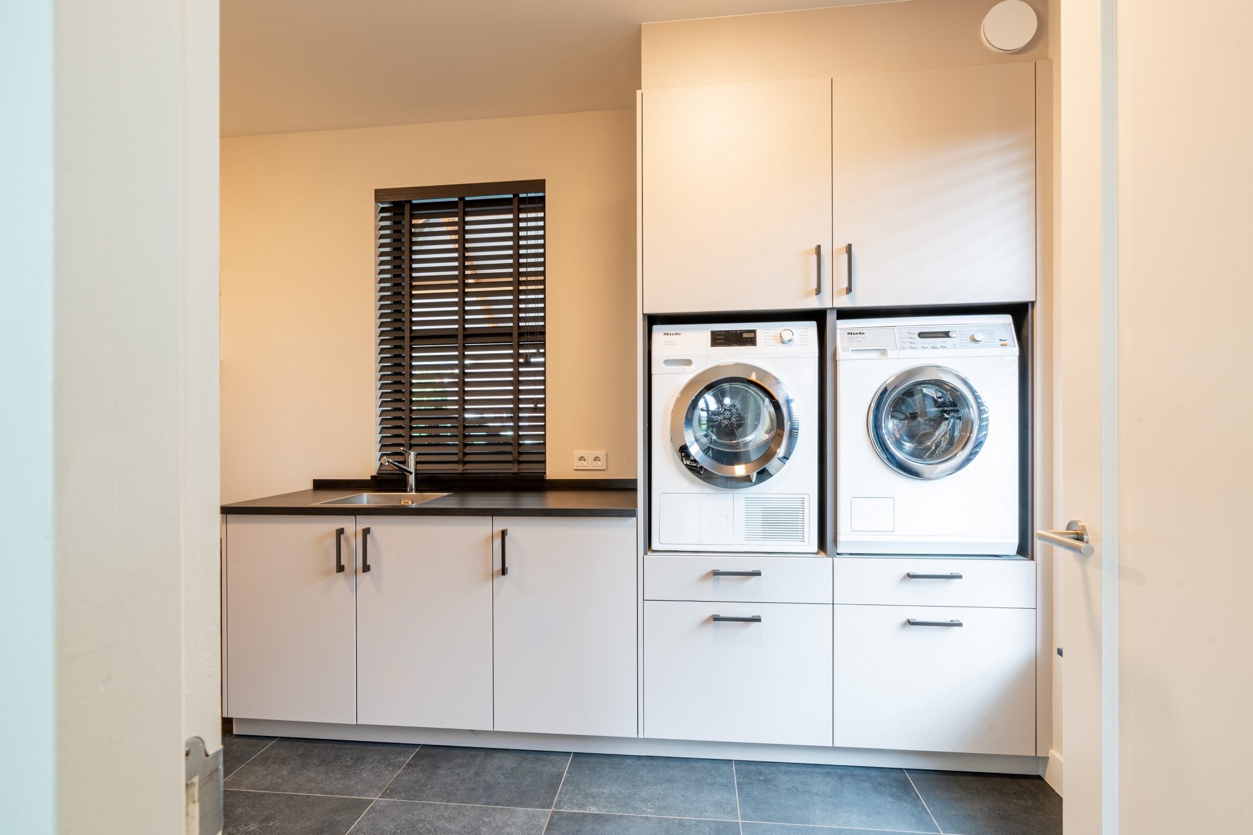Een bijpassende bijkeuken en slaapkamerkasten. Zowel voor de bijkeuken als de slaapkamerkasten zijn Mereno Monza fronten gebruikt. In de bijkeuken in de kleur kasjmier grijs en in de slaapkamer zwart. Op deze manier wordt er een écht totaalinterieur gerealiseerd.