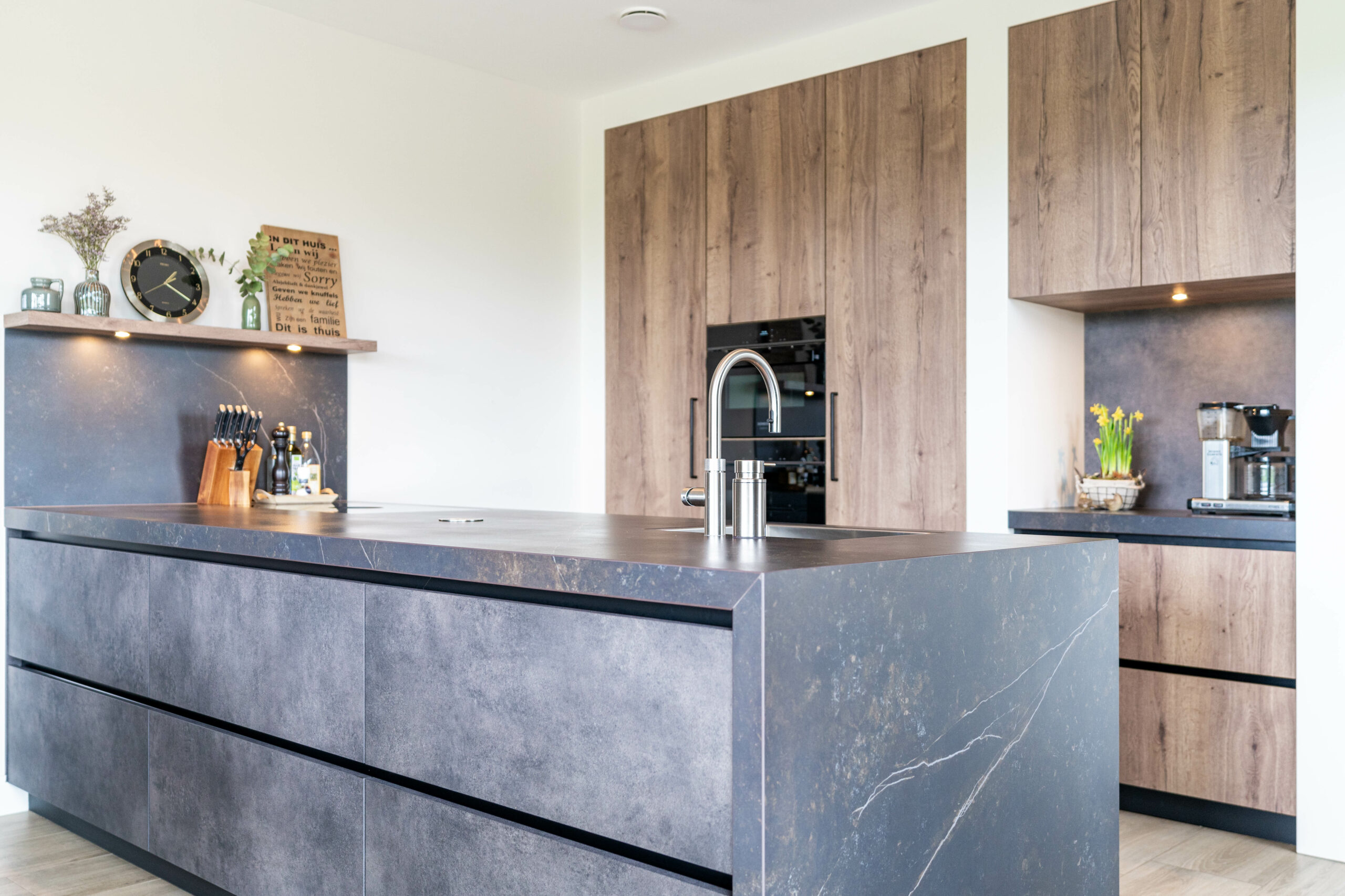 Deze ruime keuken is voorzien van materialen die echt de natuur naar binnen halen. Zo zijn beide verschillende fronten in deze keuken voorzien van een afwerking met een natuurlijke uitstraling en heeft het werkblad ook een natuurstenen look. Door deze natuurlijke tinten krijgt de keuken een robuuste maar tegelijkertijd een moderne uitvoering.