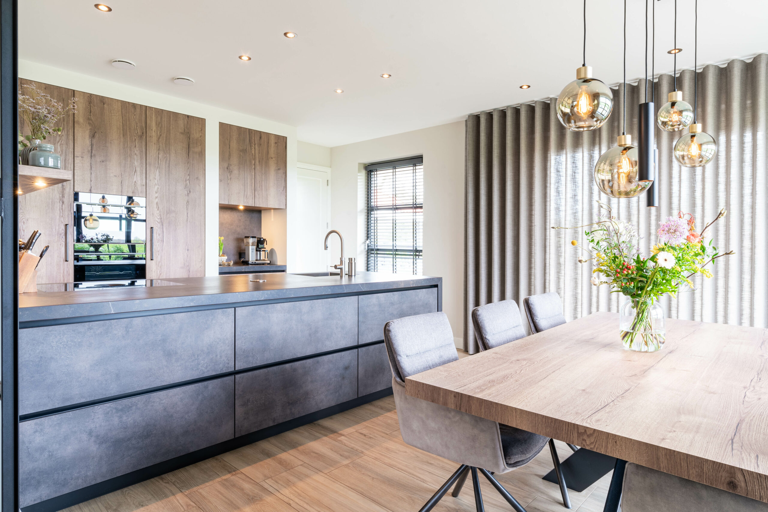 De kastenwand is voorzien van Mereno Monza fronten in een robuuste houtlook. In het kookeiland is er gekozen voor Mereno Monza grijsbruine fronten. Deze fronten hebben de structuur en de uitstraling van écht leer.