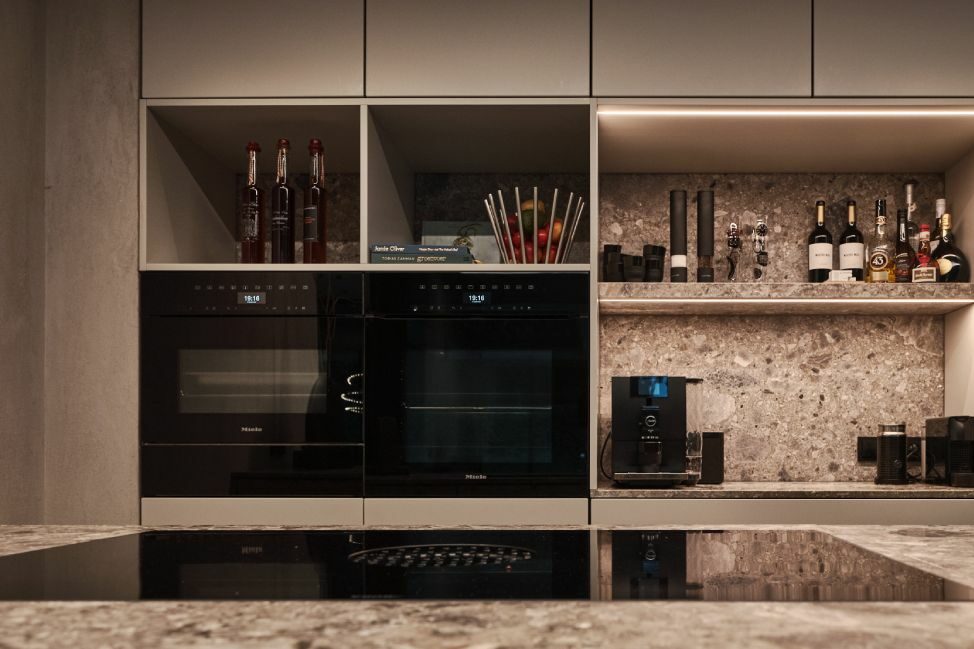 Een veelgebruikt materiaal in deze woning is het eiken fineer quartier. Dit stijlvolle front komt onder andere terug in het haardmeubel, tv-meubel en in de kastenwand in de hal. Daarnaast bestaat het kookeiland en de rugwand in de keuken uit natuursteen. De Mereno Milano fronten die in de kastenwand zijn geplaatst, hebben exact dezelfde kleur als het stucwerk. De egale kleur draagt bij aan de rust die deze keuken uitstraalt.