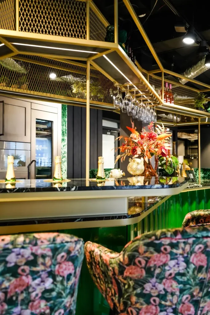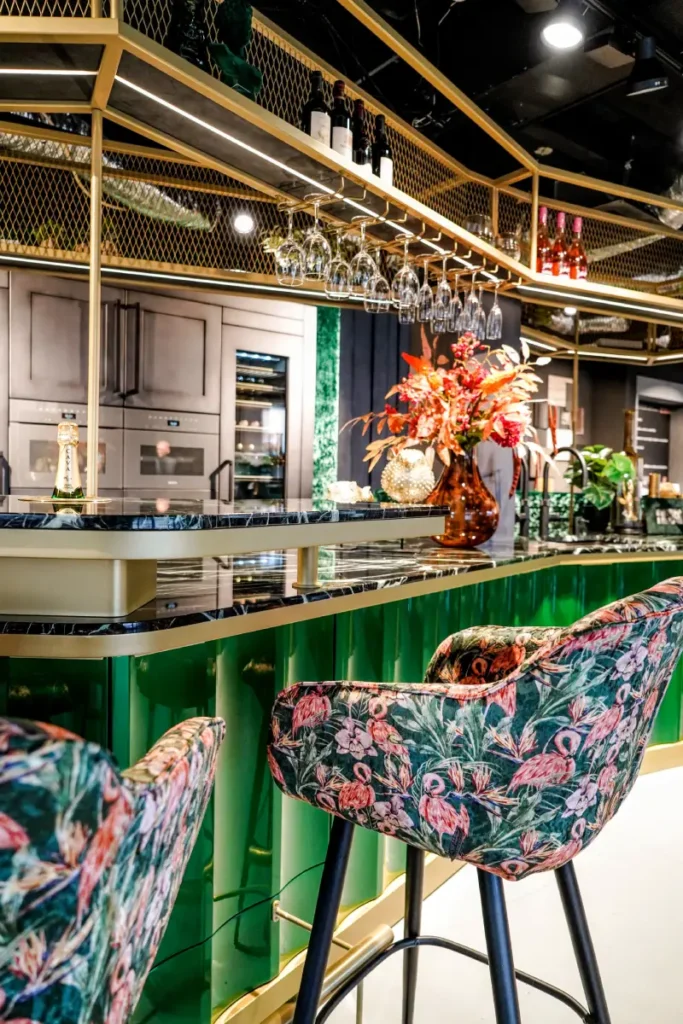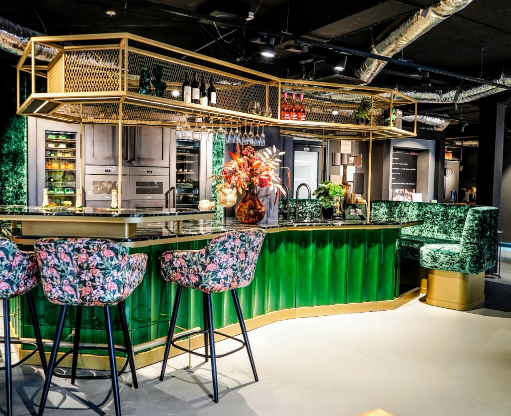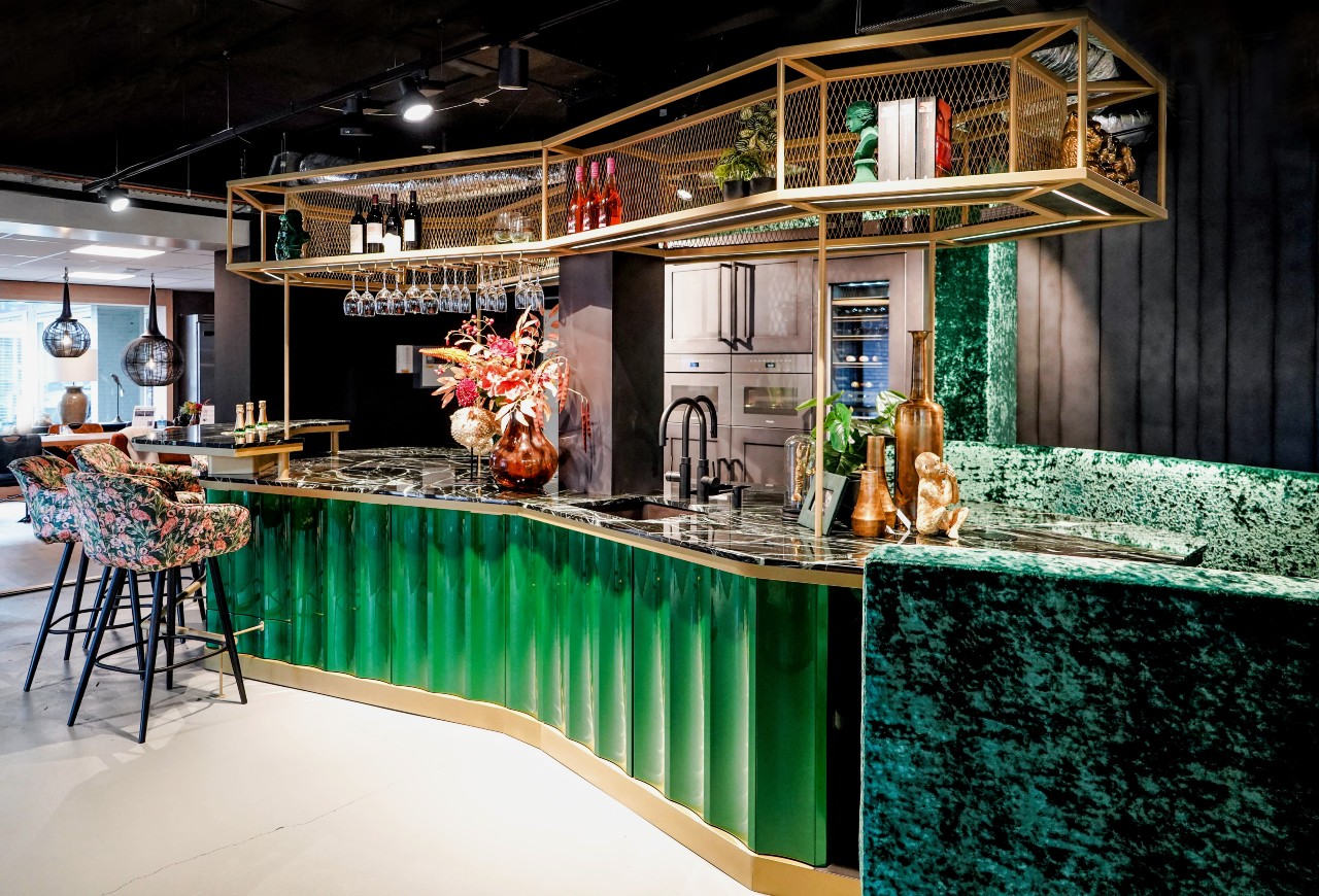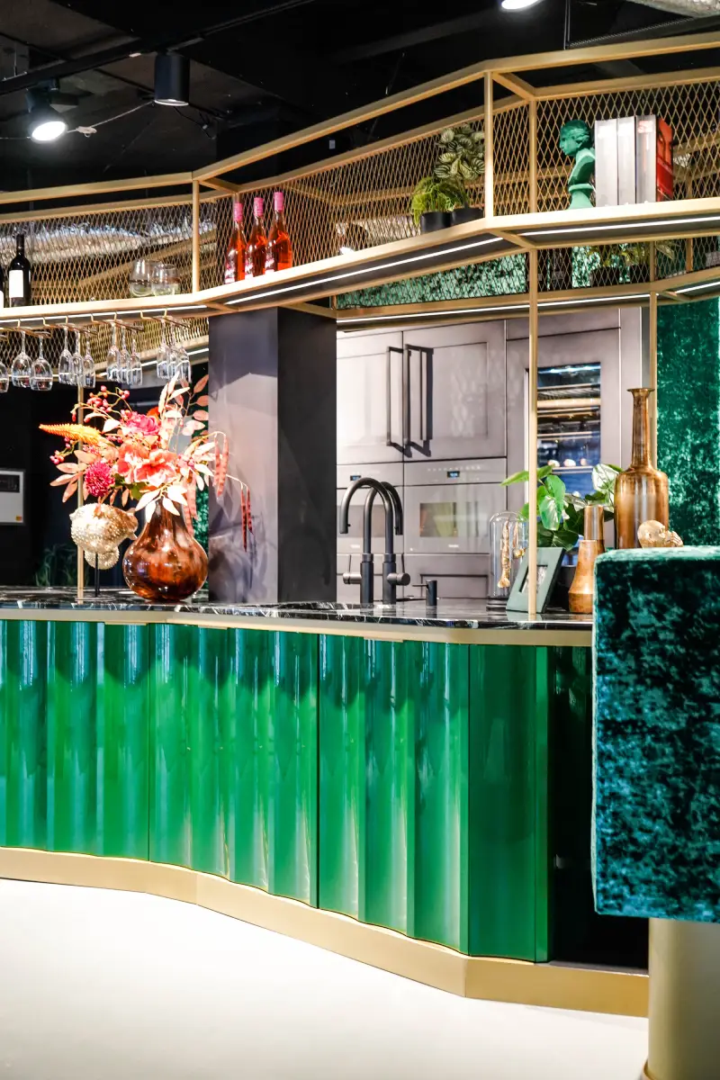 Door zijn extravagante en exclusieve stijl met rijke materialen, kleuren en luxe details, kun je niet stoppen met kijken. De OCTA M heeft een indrukwekkend uiterlijk en is een bijzondere verschijning die meteen opvalt. Deze OCTA M is voorzien van een wijnklimaatkast en een geïntegreerde wijnkoeler. De groene kastdeuren en scharnieren zijn speciaal ontworpen en gemaakt in een gebogen en golvende vorm. Het marmeren keukenblad geeft een extra luxe uitstraling in combinatie met de gouden details.