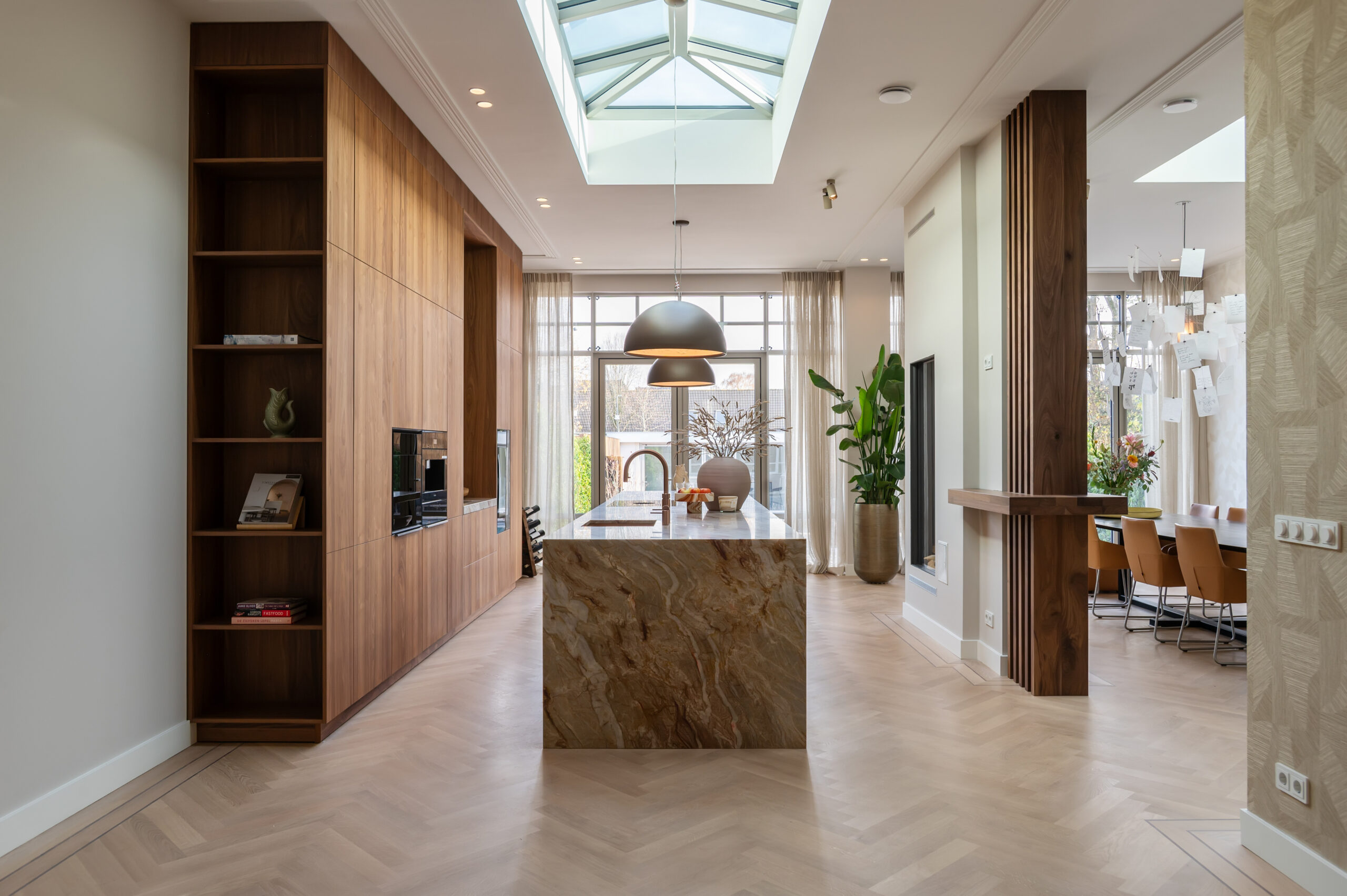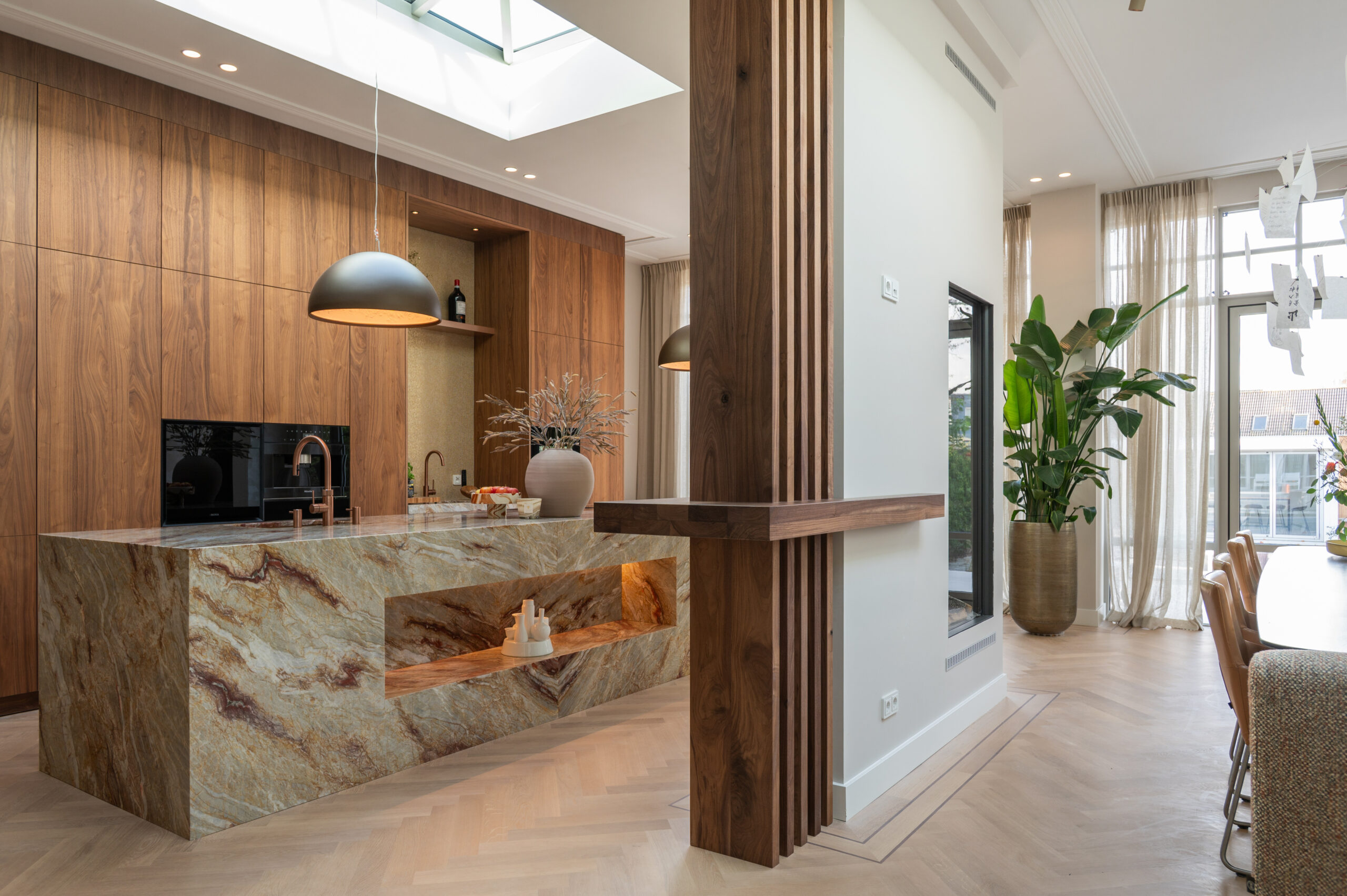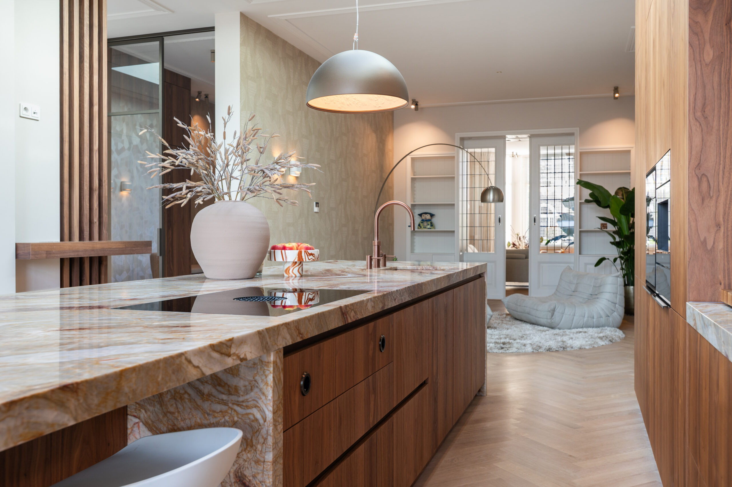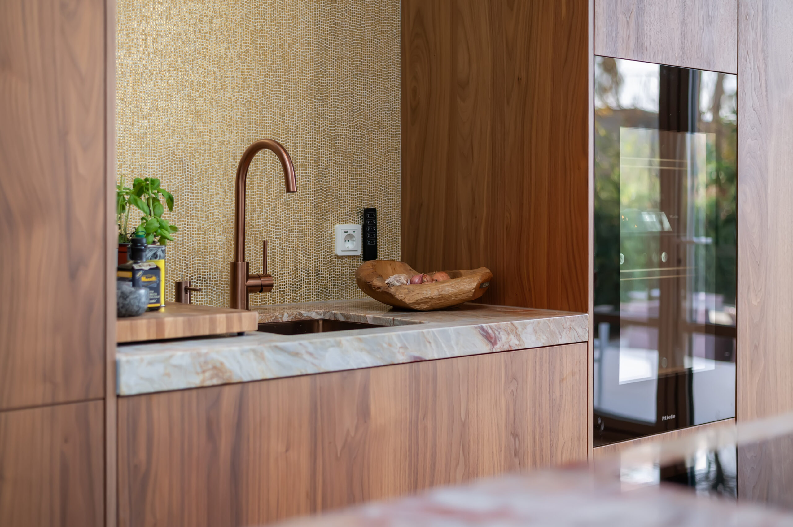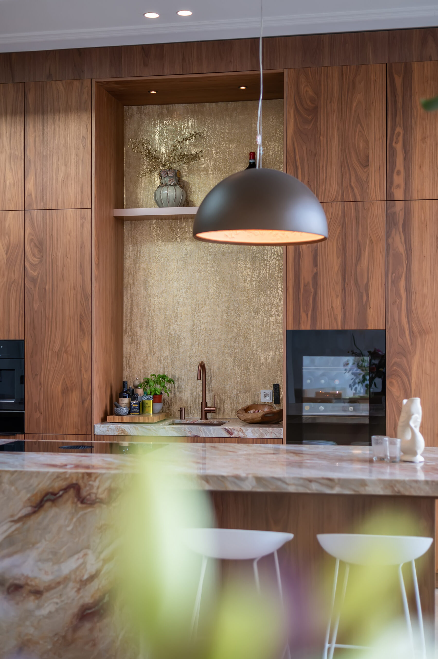 In deze woning is zowel een ruime leefkeuken met groot eiland als bijpassende garderobekasten in twee verschillende ruimtes gerealiseerd. De stijl die gecreëerd is, is een mix van modern en landelijk. De warme houten fronten worden gecombineerd met een natuurstenen werkblad, waardoor er écht een natuurlijke uitstraling wordt gecreëerd. Daarnaast zit deze warme keuken boordevol details, zoals de open kast op de kopse kant van de keuken, een wandschap in metallic rosé koper net als de kraan en twee spots die in de nis zijn geplaatst.