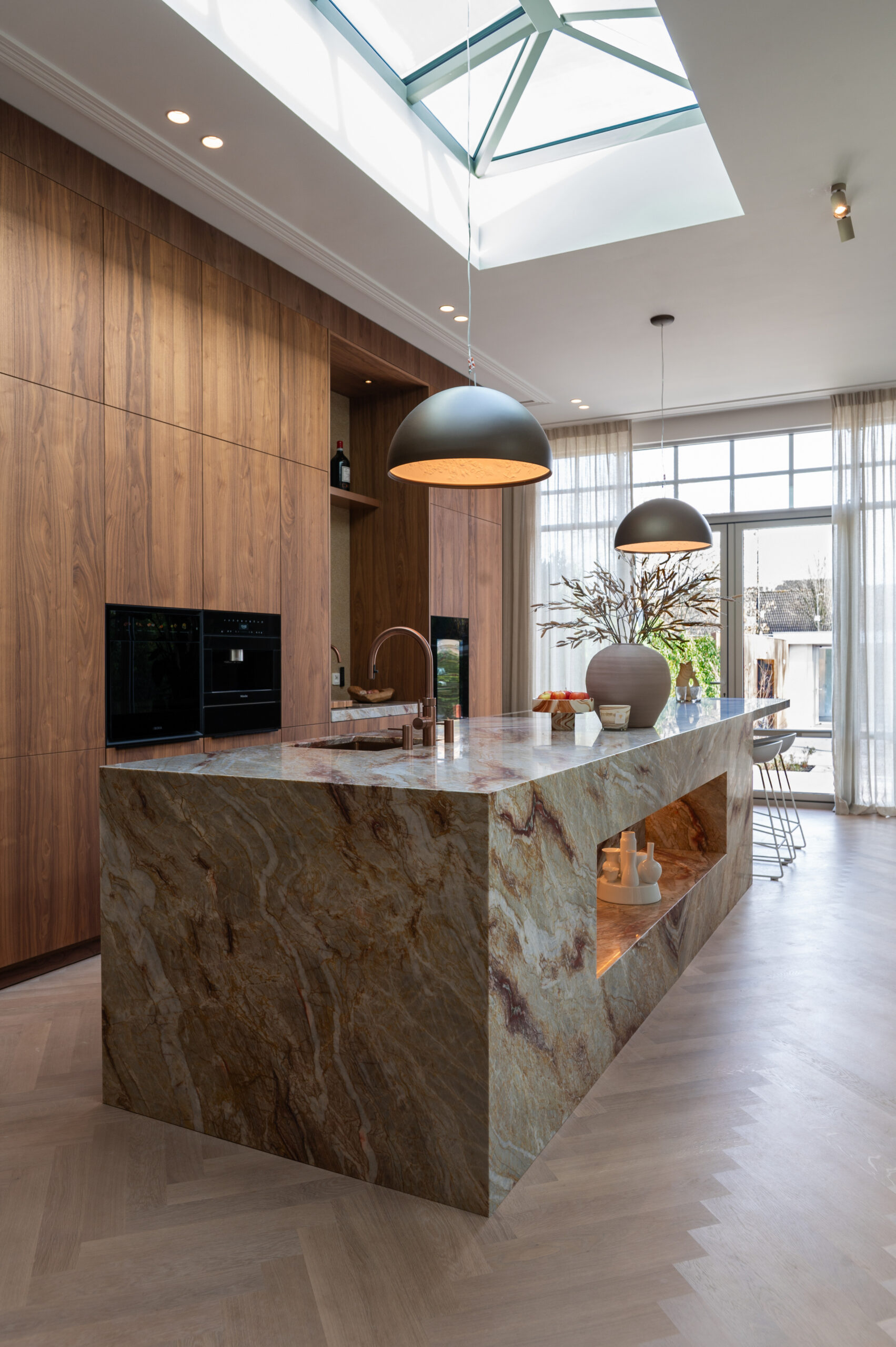 Een warme leefkeuken met ruim eiland inclusief zitgedeelte, hoge kastenwand en garderobekasten in twee verschillende ruimtes. Het eiland bestaat uit een kookgedeelte en een zitgedeelte, zodat er aangeschoven kan worden tijdens het koken. Aan de kopse kant van de keuken is een nis gerealiseerd, om extra diepte en karakter in de keuken te creëren.