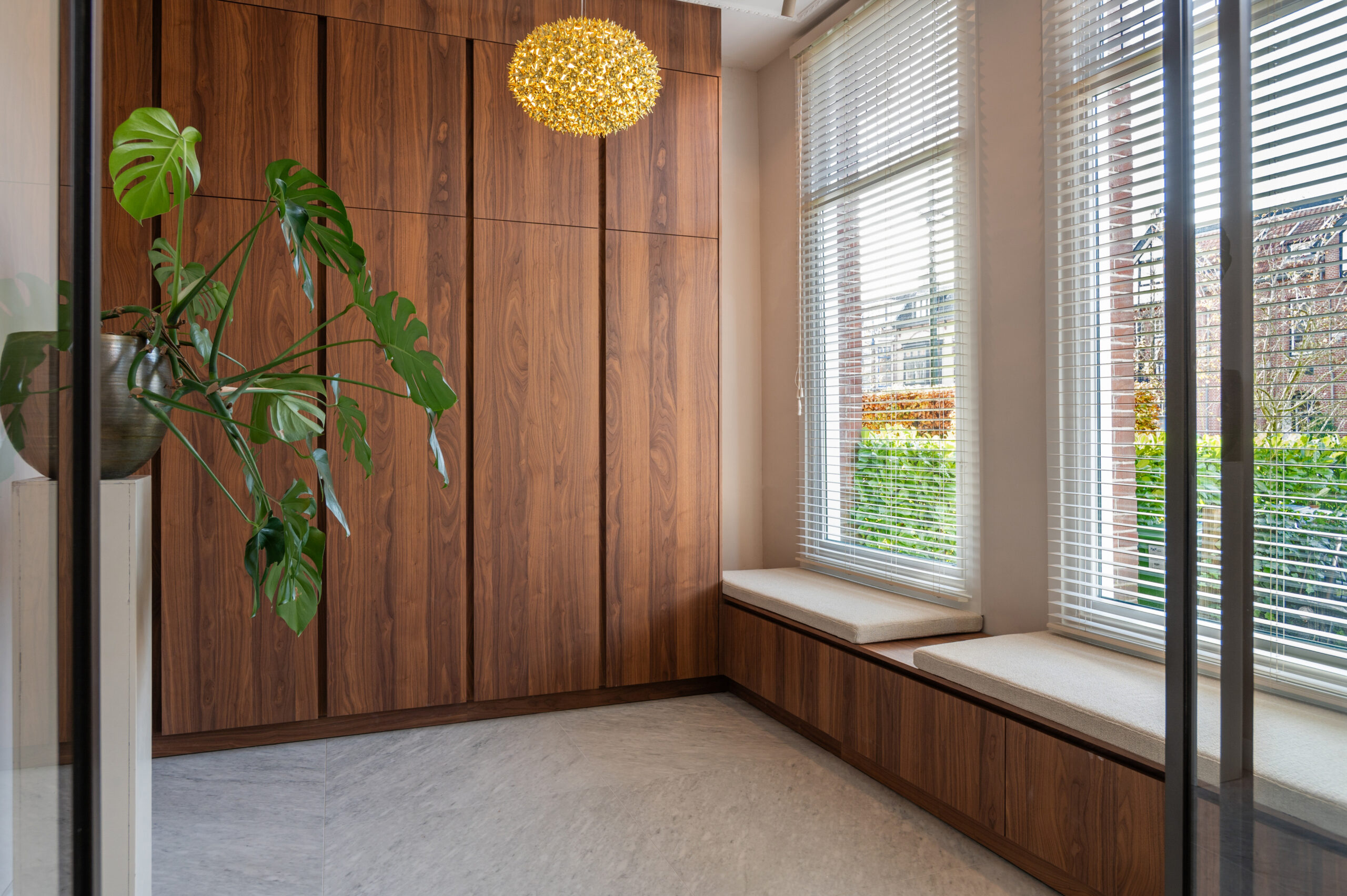 De keuken is volledig voorzien van het front Mereno Milano notenfineer. Deze warme fronten brengen sfeer en rust in de keuken. De garderobekasten zijn van exact hetzelfde front voorzien, om zo eenheid in het huis te creëren.
